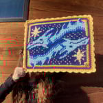 double dragons, double stars, cardboard backing. i like them because they both have what i would describe as "grandpa grins", kinda cheeky and knowing. just like all dragons... probably because they have a hoard to protect and they know they're gonna outsmart you if you try to steal it... the backing on this one is a little wild but i'll fix it up before i send it