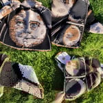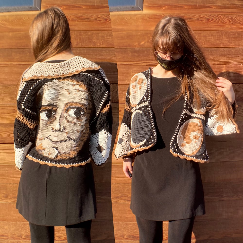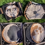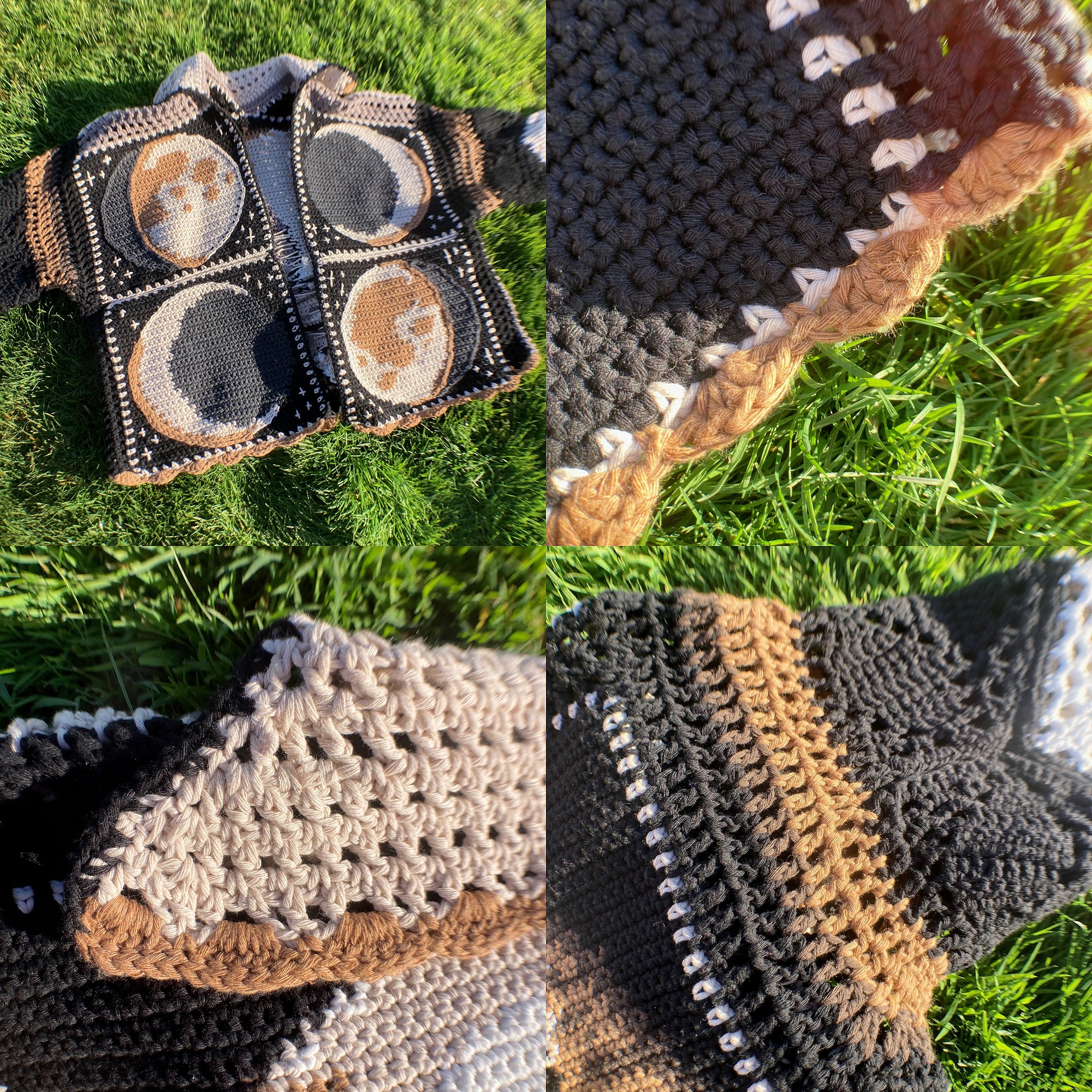 this is actually more of a cardigan than a sweater. it has bell sleeves and moon designs all over it (including waning, crescent, and full moons - one of them has a face). this is a totally improvised sweater so the fit is kind of weird but it also works as a centerpiece for any equinoxes, solstices, or eclipses