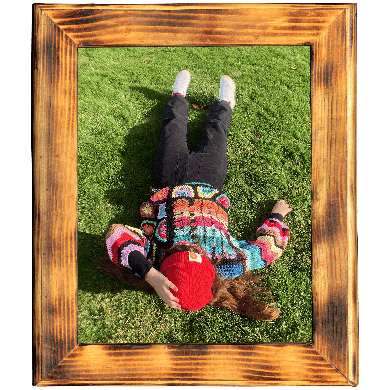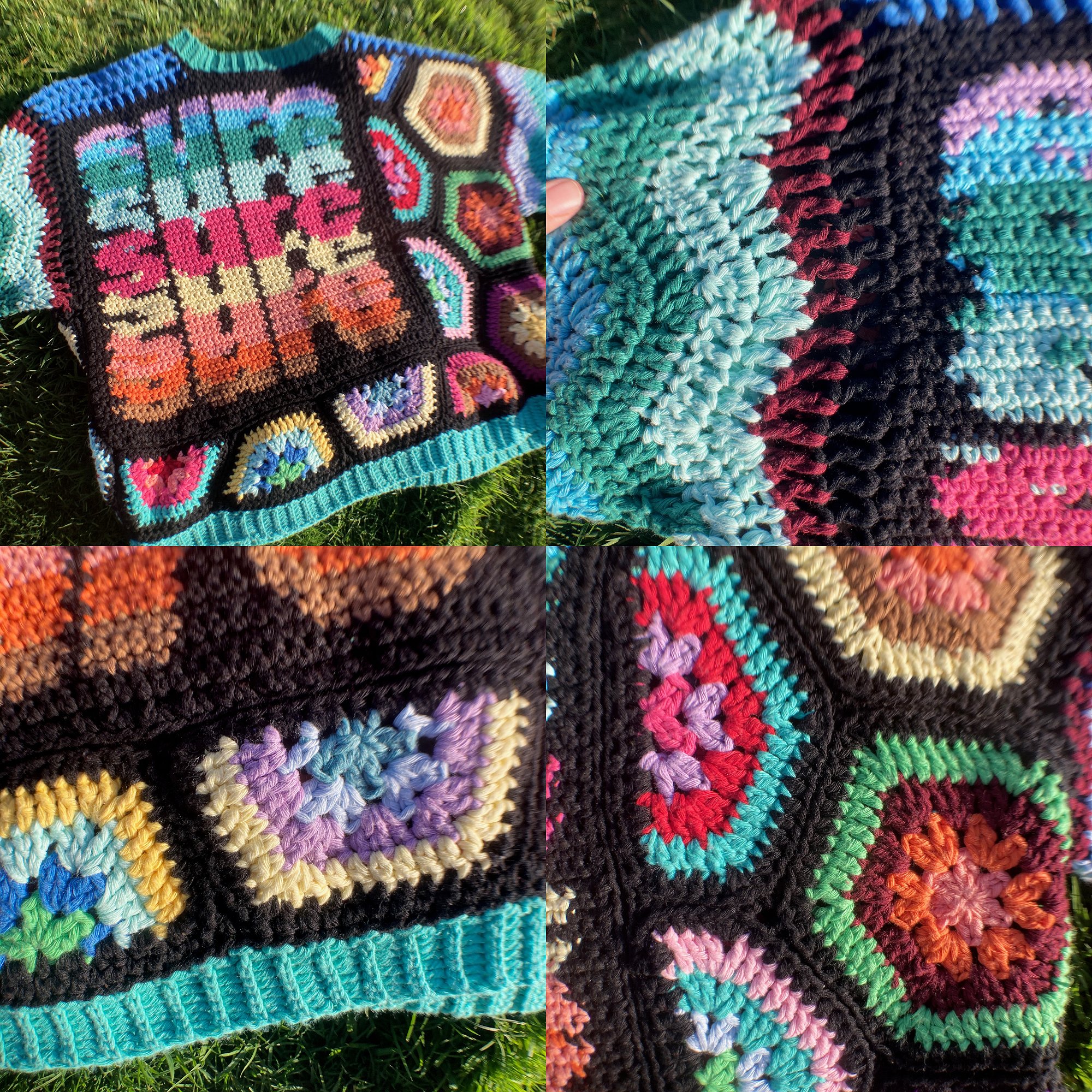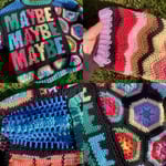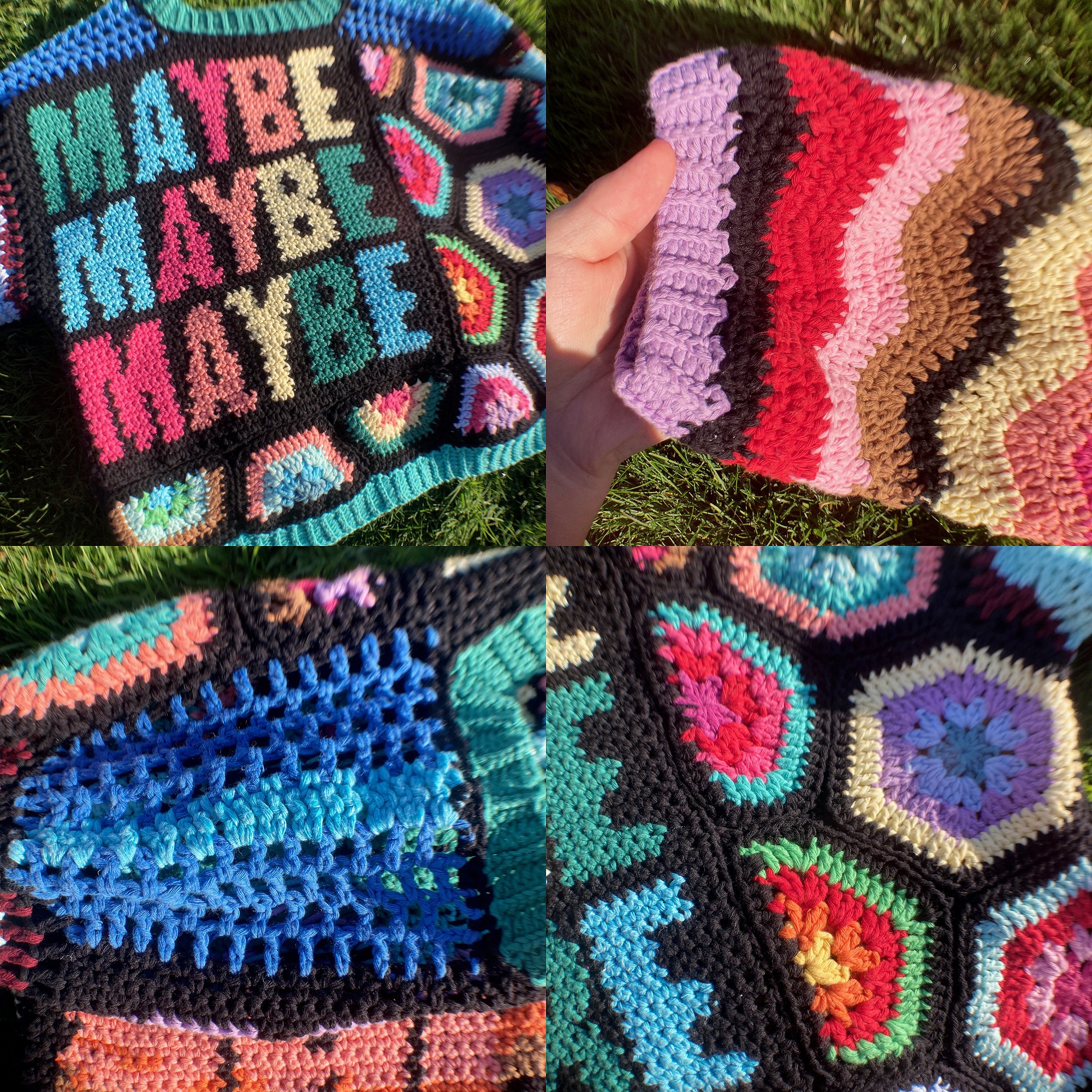 this is a reversible sweater that says maybe on one side and sure on the other. it has hexagonal granny squares on it and when i tell you figuring out how to half those took up 80% of my brain space i'm not exaggerating at all. chevron sleeves, ribbed cuffs, this sweater is actually really fashionable and can answer most questions for you